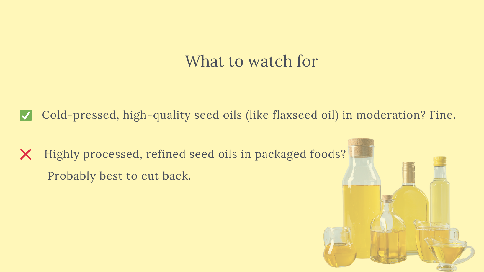 ✅ Instead of obsessing over every drop of seed oil, focus on balance. Swap refined seed oils for extra virgin olive oil, avocado oil, and grass-fed butter—and make sure you’re getting enough omega-3s.