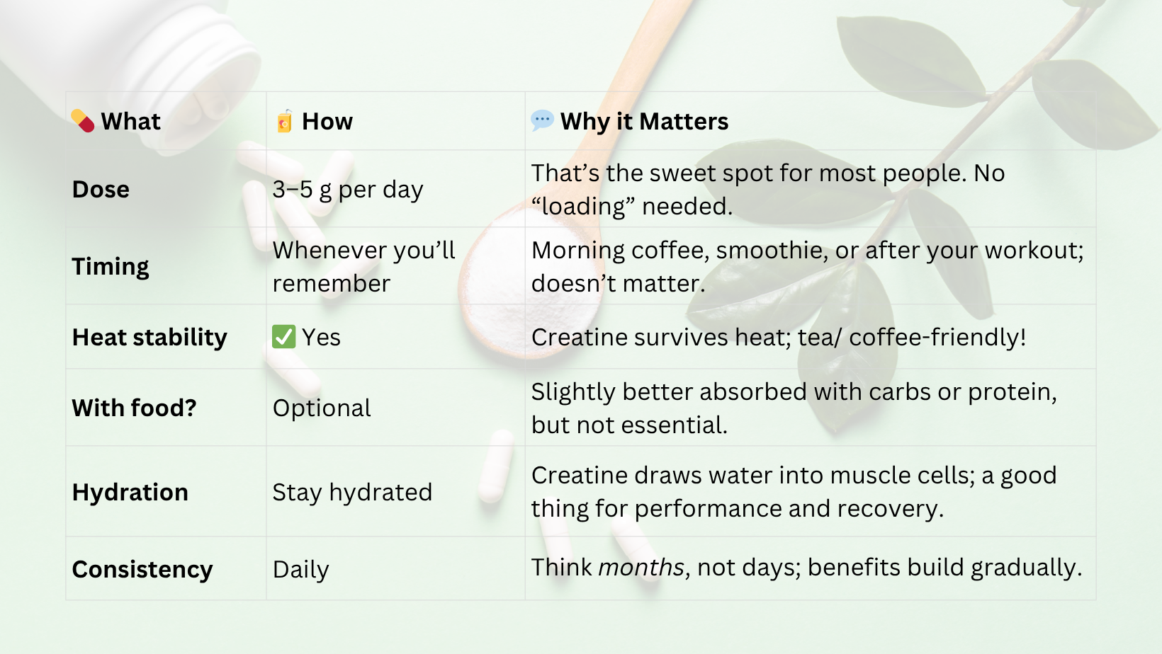 Interestingly, one new study found no extra muscle gain beyond what good resistance training already provides, but higher doses (above the classic 3–5 g/day) might offer more cognitive benefits.