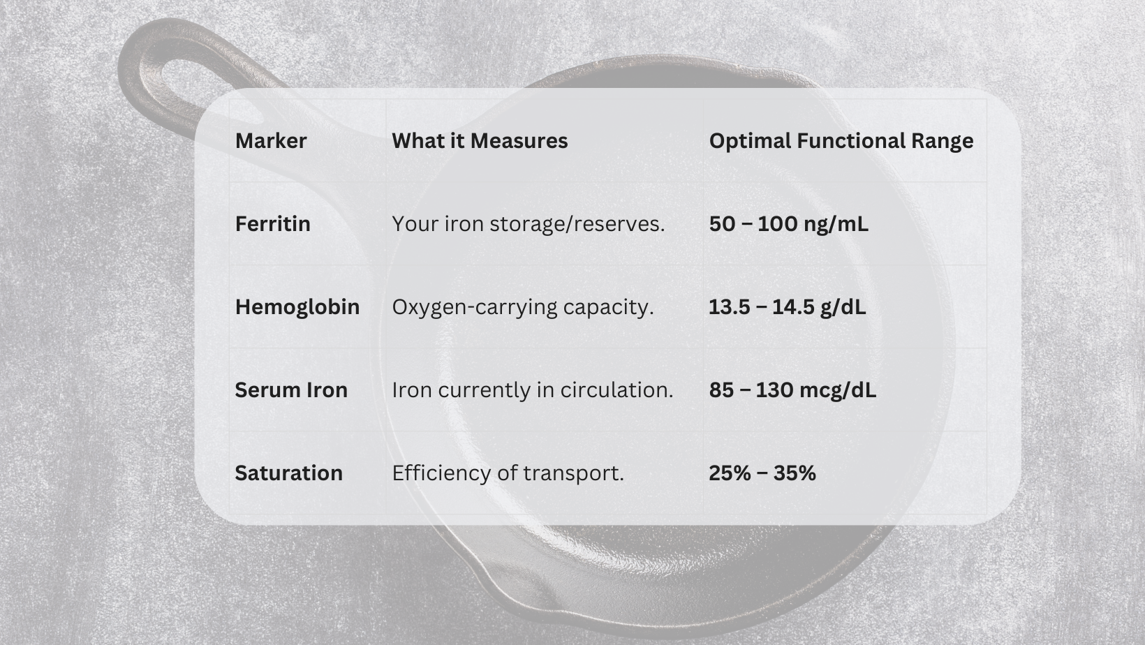 If you have been feeling unusually depleted, it is time to move from guesswork to data. I suggest requesting a full iron panel that includes Ferritin to see if you are meeting the optimal ranges mentioned above. While dietary shifts and using cast iron are excellent functional strategies, they work best when integrated into a comprehensive, personalized health plan.